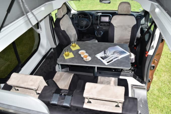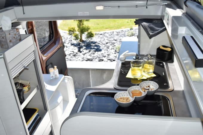 L’Auto-Loisirs LV concentre tout le savoir-faire de l’aménageur de Bressuires (79). Il se distingue par une implantation originale et une autonomie importante.L’aménagement se divise en deux zones de vie bien distinctes. La partie avant du véhicule est dédiée à la prise des repas. La dînette se compose d’une banquette face route pour deux ou trois (en option) occupants, d’une table sur pied central et des deux sièges cabine montés sur embase pivotante. La partie arrière du véhicule est pourvue d’un bloc-cuisine en L. Ses dimensions généreuses permettent de l’équiper correctement. On y trouve donc un réfrigérateur à compression de 65 l, un réchaud deux feux et plusieurs rangements. Sous le plancher, se trouve un bac à douche. Après avoir installé le rideau idoine, on peut faire une petite toilette grâce aux 50 l d’eau propre contenus dans le réservoir. Un moment d’autant plus agréable que l’on dispose d’eau chaude générée par un combiné chauffant également l’habitacle.
